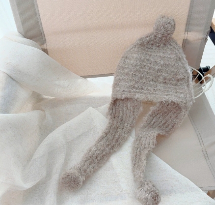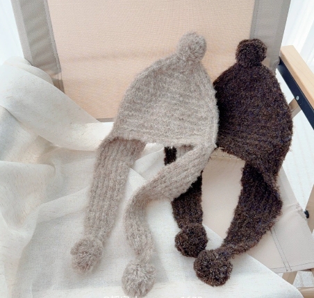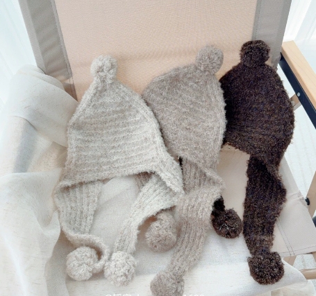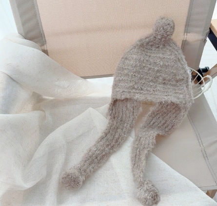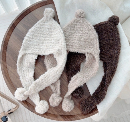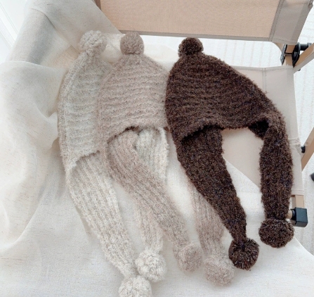 長い紐状の耳当てが寒さからしっかり守りながら、結んだり垂らしたりして様々な着こなしが楽しめる