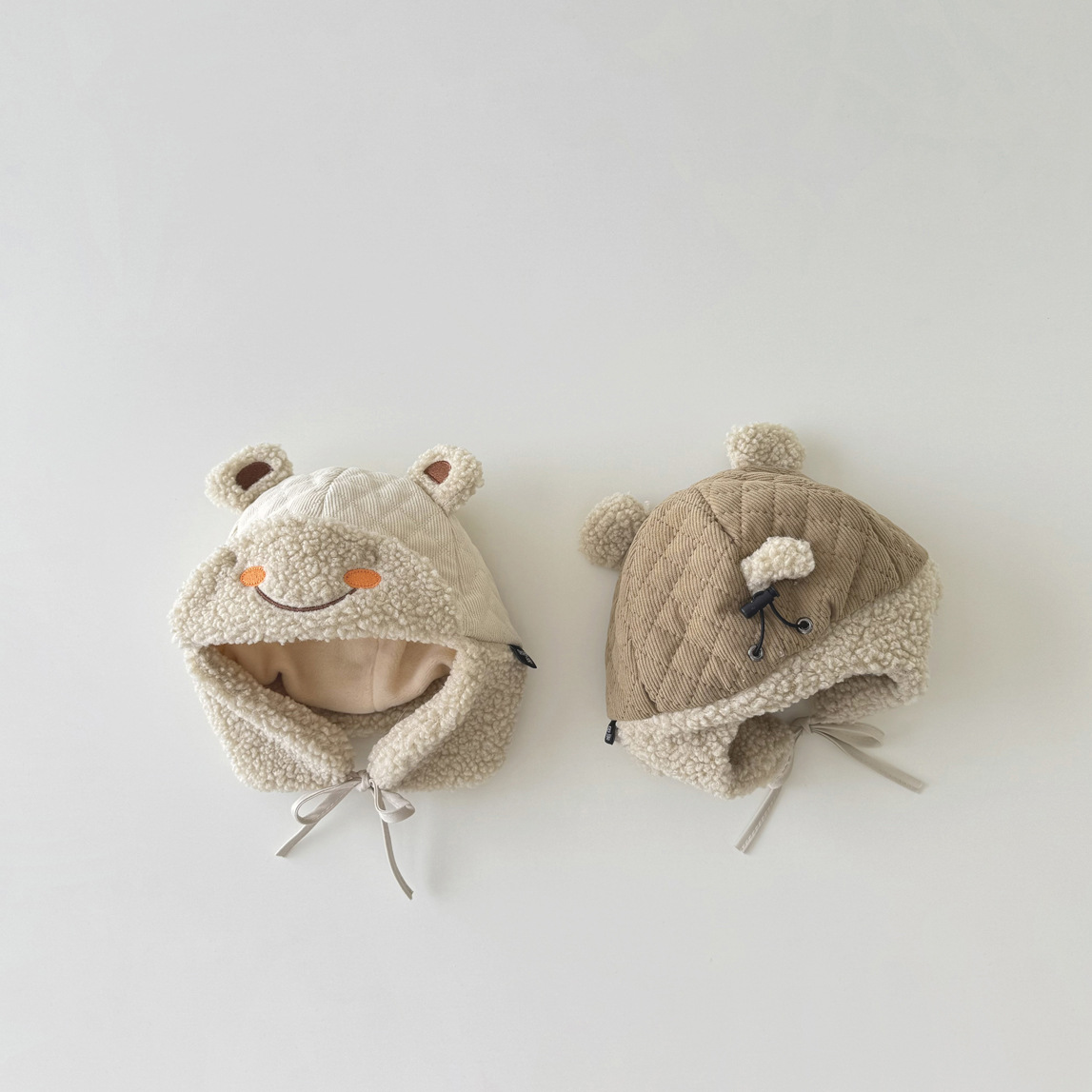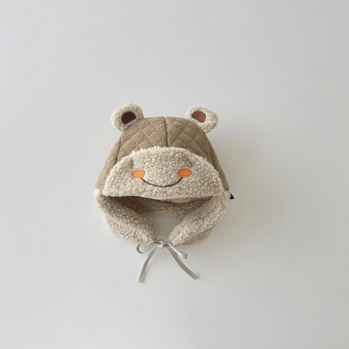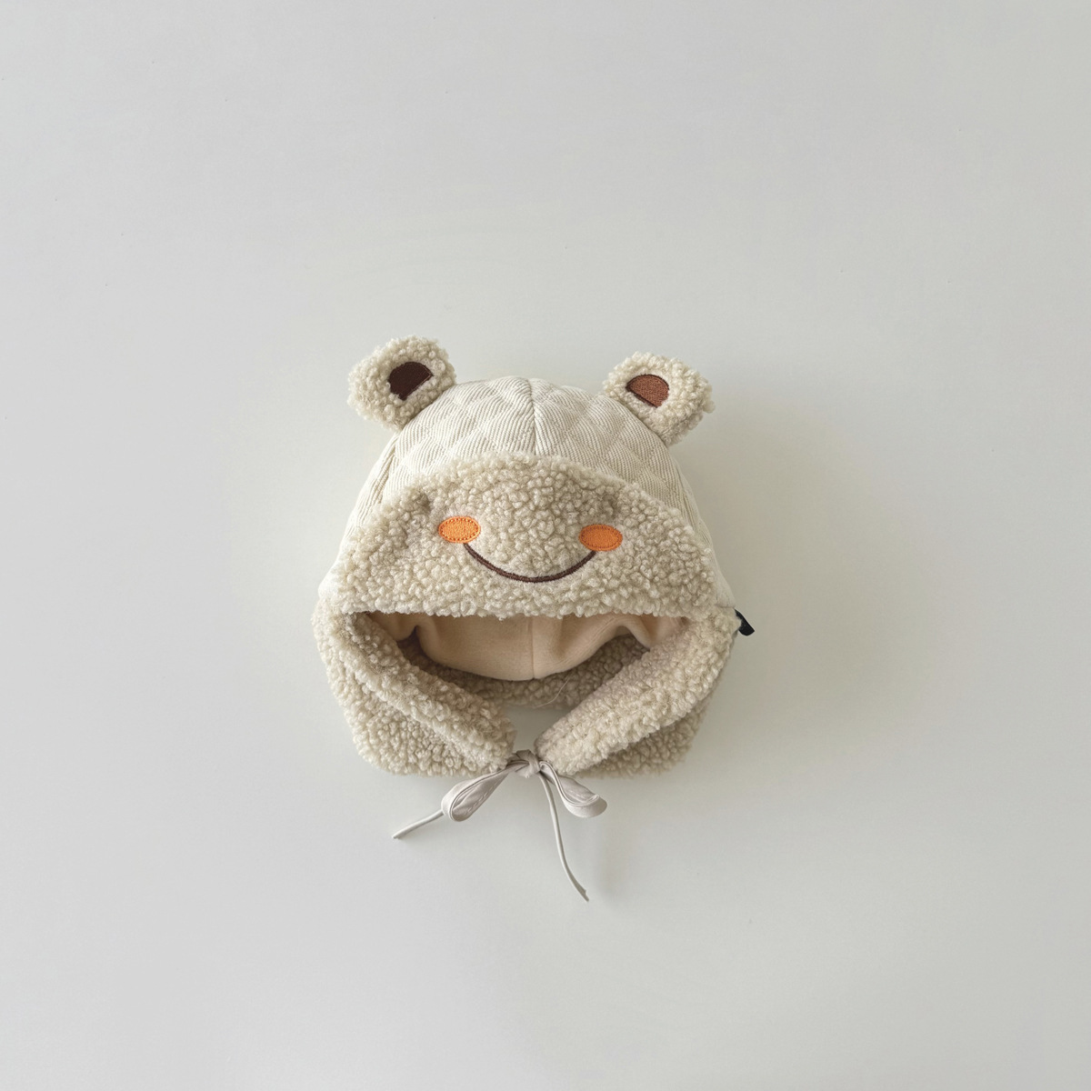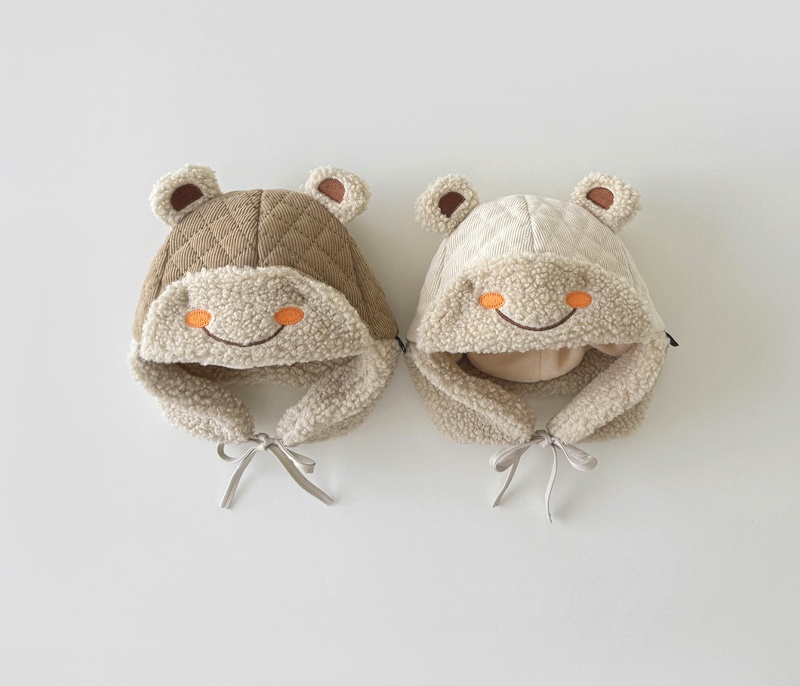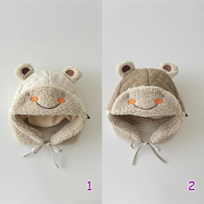 立体的なくまの耳と優しい笑顔の刺繍が可愛らしく、着用するだけで癒しの存在感を演出します。